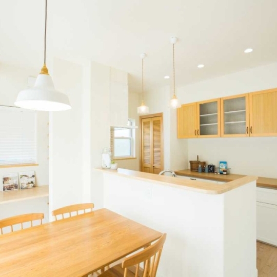 リビングドアからまっすぐの位置にある造作のキッチン収納。ダイニングには赤い縁取りのミルクガラスのペンダントライト。ニッチやキッチンにもタイルがランおクロスをチョイス。挿し色には優しいグリーンのドア。ちぇくのリネンカーテン。ひとつひとつの素材がナチュラルな空間に一役かっています。そのひとつだけでも可愛いのですが、それらをうまくMIXすることで、本当に居心地の良い素敵な空間になりました。