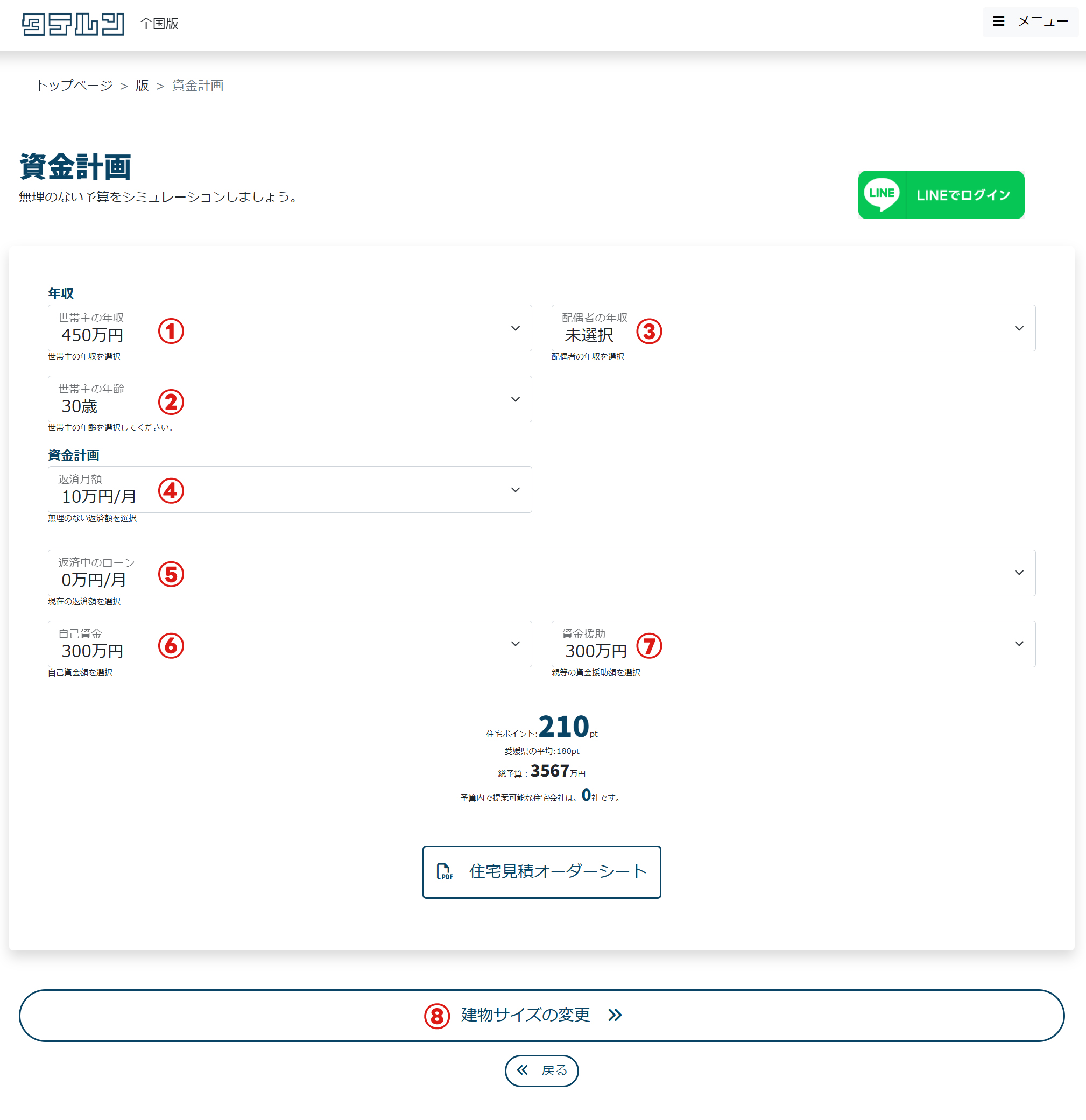 頭金として出せる自己資金の金額を選択してください。 ⑦ 資金援助と合わせて、総予算の20%程度用意する事が望ましいとされています。