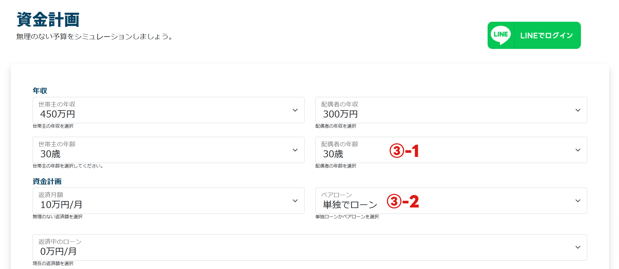 配偶者の年収を選択してください。配偶者の年収を選択すると、配偶者の年齢とペアローンが選択できるようになります。